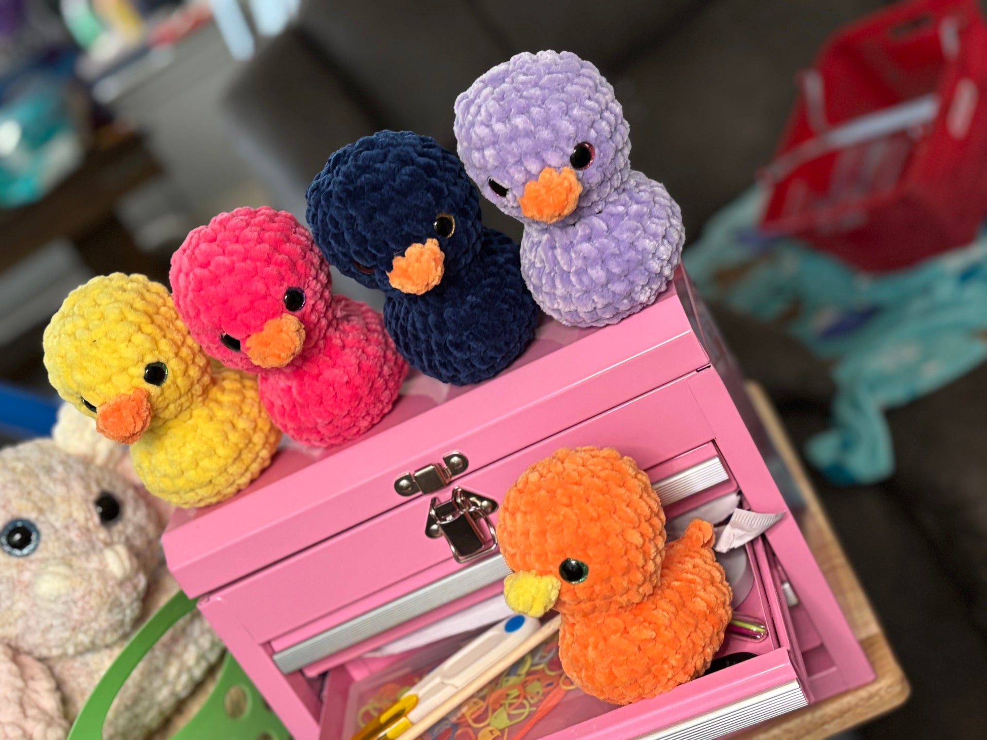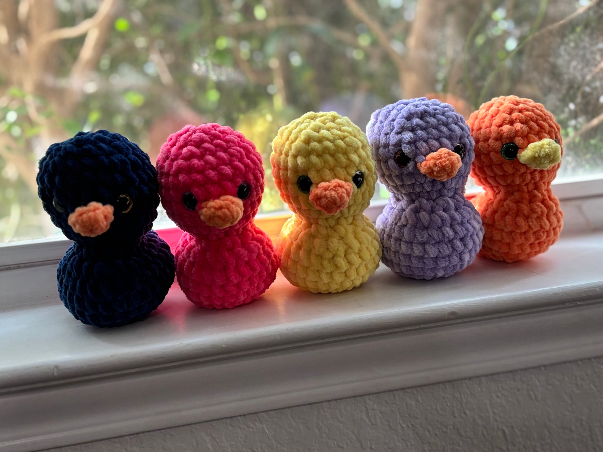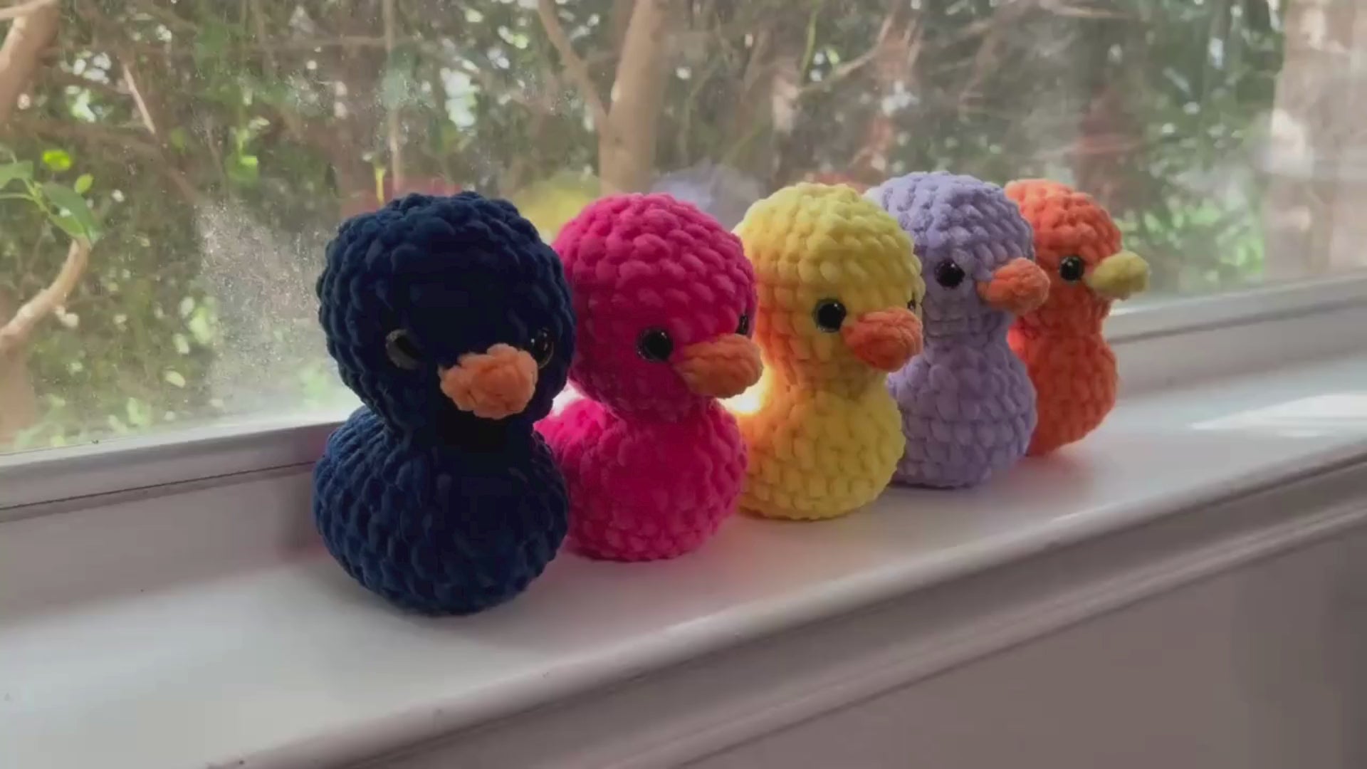 Brighten up any space with our irresistibly soft and colorful Plush Duckies! Hand-crocheted with super soft, velvety yarn, each ducky in this set brings its own pop of color—navy blue, hot pink, sunny yellow, lavender, green, and cheerful orange—with sweet, expressive eyes and a squeezable, chunky design.