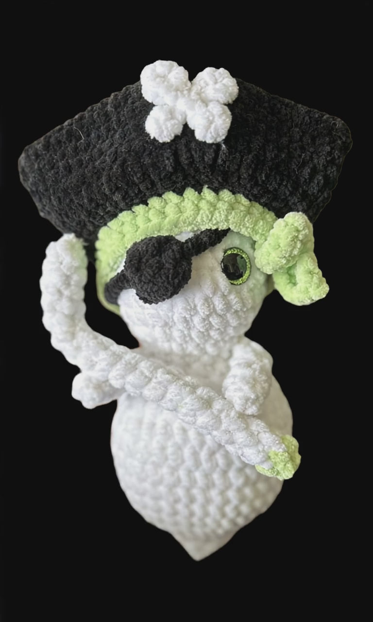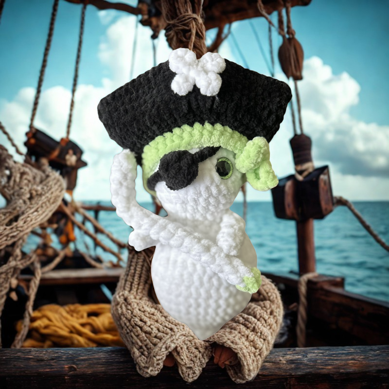 This handcrafted plush was a special custom order, featuring soft, premium yarn, a classic pirate hat detailed with a skull-and-crossbones, a swashbuckling eye patch, and a friendly ghostly grin. With its playful design and high-quality details, this plushie is made to charm anyone who loves pirates or paranormal pals.