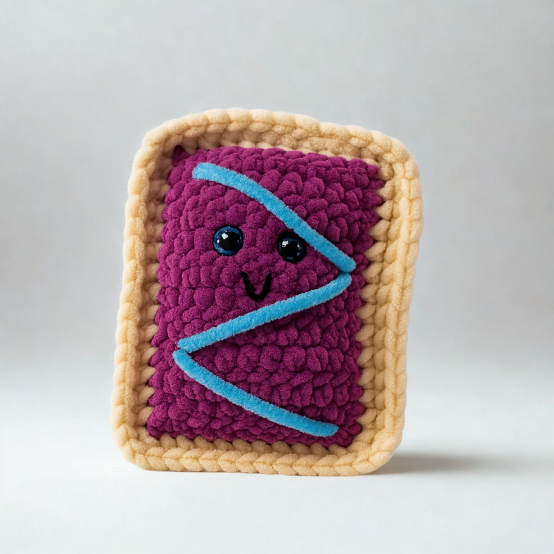 I lovingly handcraft each Mixed Berry Snuggle Tart using rich purple yarn that perfectly captures the deep, delicious color of mixed berries. I carefully select sparkly safety eyes that give each one their own unique personality, and I embroider sweet smiles that never fail to brighten someone's day. The signature turquoise blue accent stitching creates that classic breakfast pastry look we all know and love.
